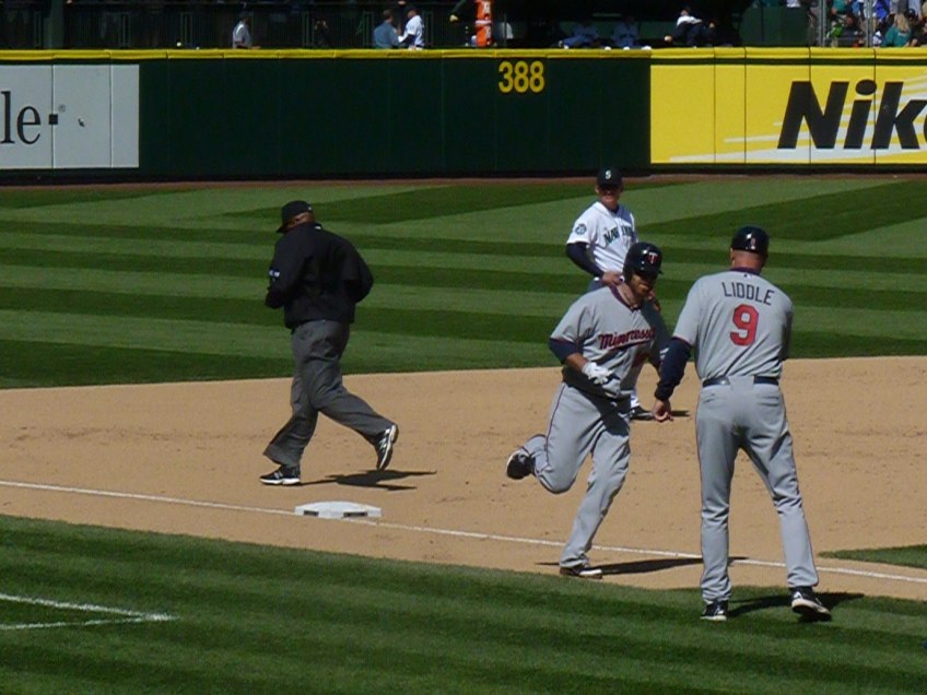 P1110191 Published May 20, 2012 at 1382 × 1037 in Mariners 5, Twins 2 Doumit rounds third during his homerun trot.