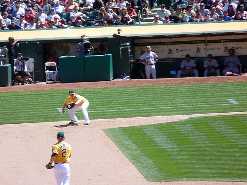 Pennington throws to Moss for the second out Published July 4, 2012 at 2048 × 1536 in A’s 3, Red Sox 2 Pennington throws to Moss for the second out