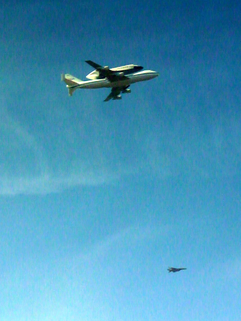 01-P1150917 Published September 21, 2012 at 826 × 1102 in Chasing Endeavour’s Last Flight Down the California Coast My first view of Endeavour (OV-105) flying over the Oakland airport along with it’s accompanying jet.