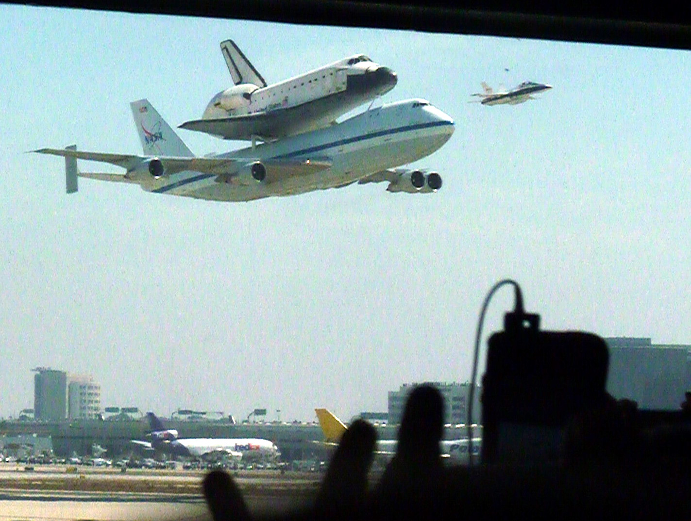 07-P1160028 Published September 21, 2012 at 1423 × 1074 in Chasing Endeavour’s Last Flight Down the California Coast Endeavour flying over LAX… and the shadow of some guy’s iPhone capturing it